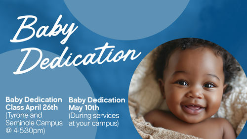 Baby Dedication Class is the first step in our Baby Dedication experience and is happening on Sunday, April 26 from 4:00-5:30pm at the Tyrone and Seminole Campuses for parents of children ages 5 and under (Downtown attendees please attend at Tyrone). This class is a meaningful time for parents to learn more about the heart behind dedication, grow in faith-centered parenting, and connect with other families in a similar stage of life. Then, families who attend the class will participate in Baby Dedication during service at their campus on Sunday, May 10 (Mother's Day). For more information and registration, click the button below!